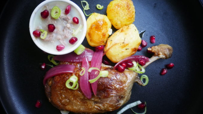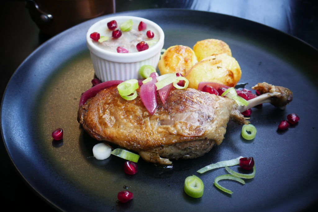 Når lårene skal serveres steges de sprøde i andefedt. Her er lårene serveret sammen med anderilette og kartofler stegt i andefedt.