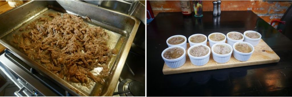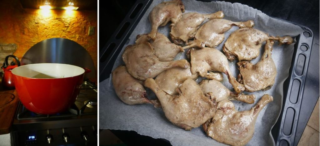 Nu koges lårene i fedtet i ca. 4 timer ved 90 grader. Lårene er færdige, når kødet løsner sig fra det benet.
