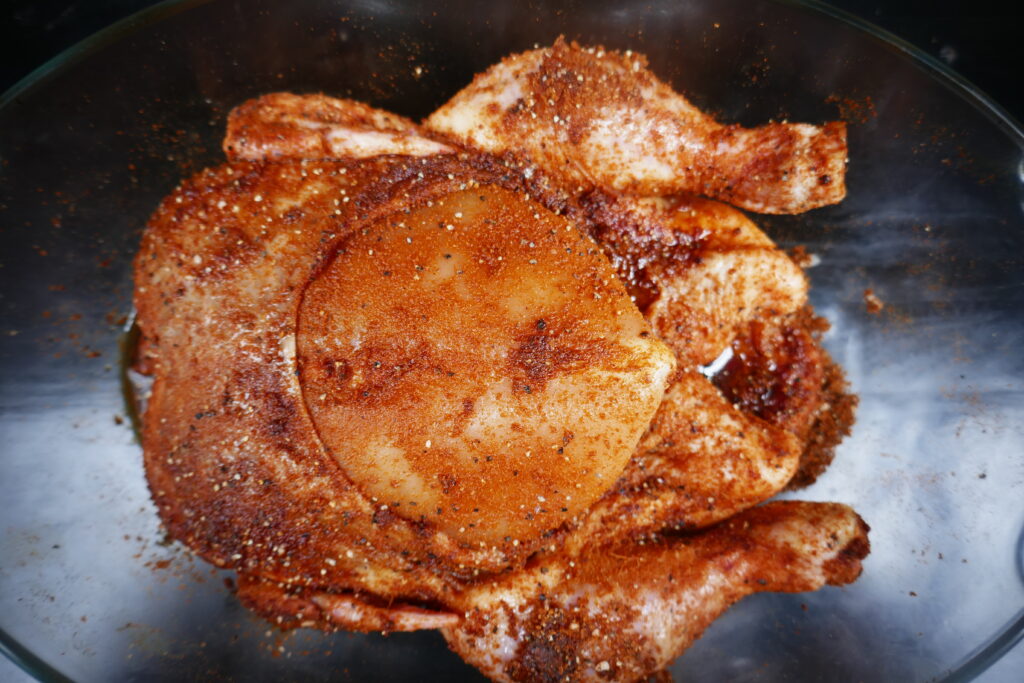 Kom kyllingen i en stegeso eller lignende. Gnid kyllingen godt med rubben, både udvendig og indvendig, også under skindet. Lad kyllingen trække med rubben i 3 – 4 timer.