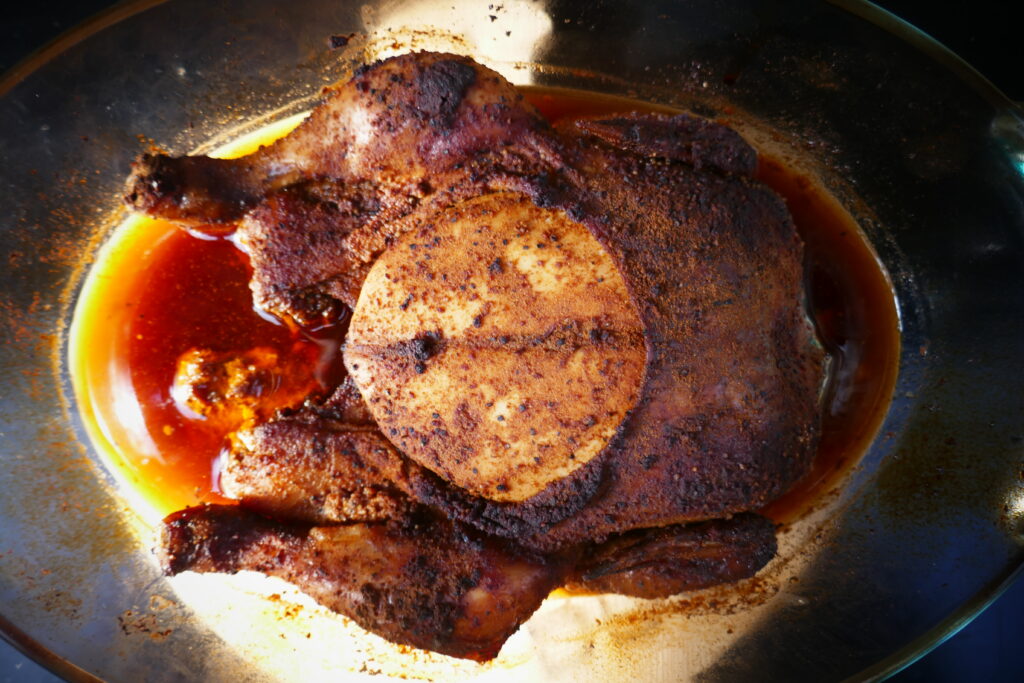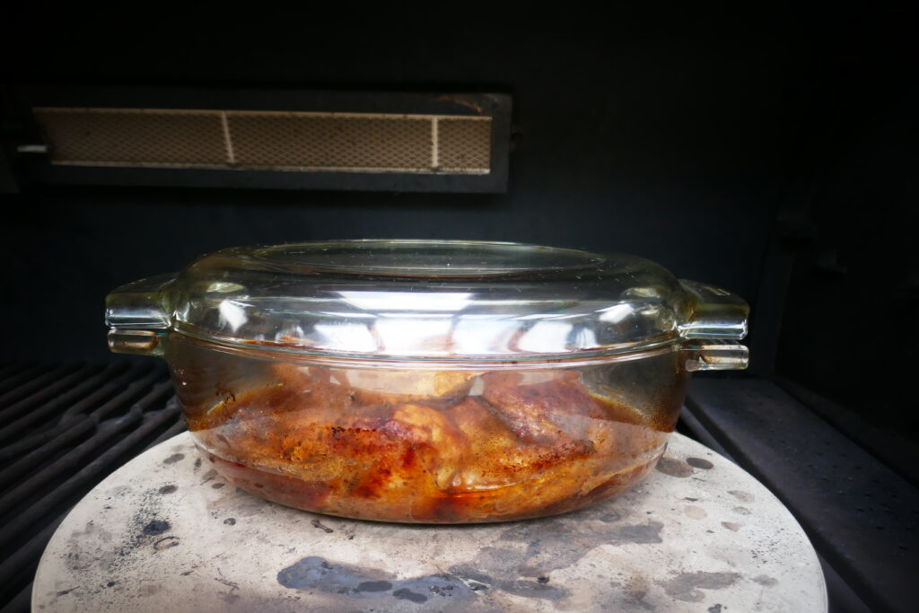 Sæt kyllingen i grillen/ovnen ved 110 grader i 4½ time.