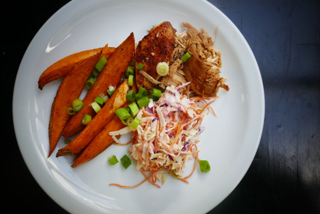 Vi serverede kyllingen med ovnbagte fritter af sød kartoffel, coleslaw og forårsløg.