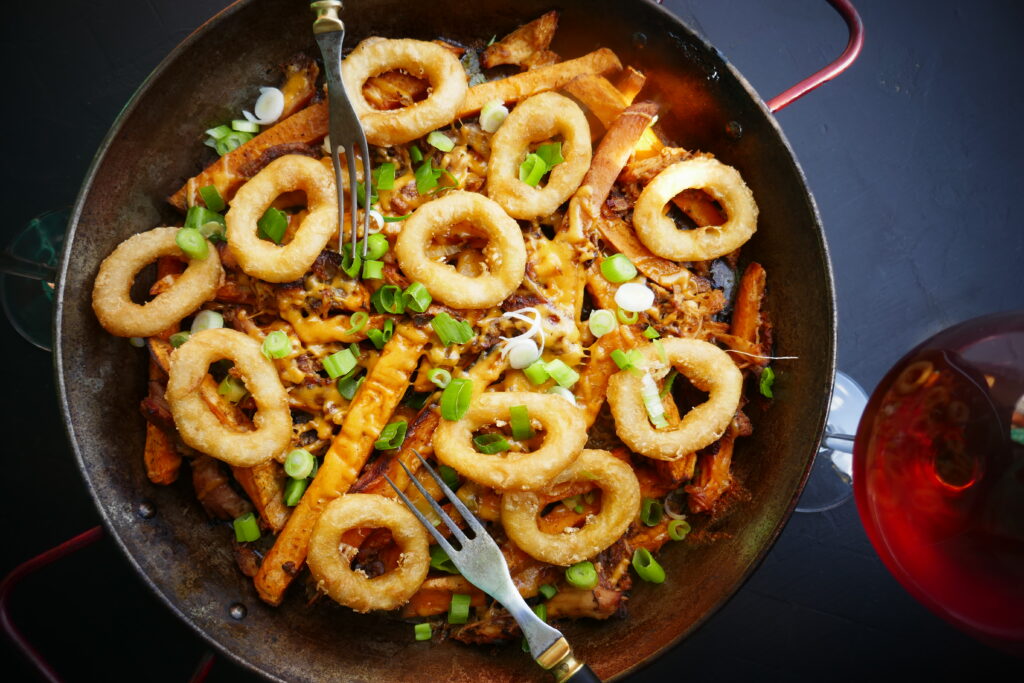 Dagen efter var der rester. Her fik vi sød kartoffel, pulled chicken med ost, løgringe og forårsløg.